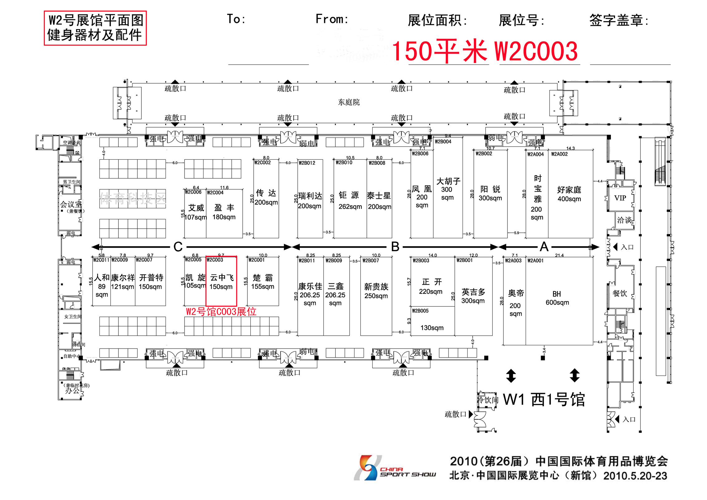 2010年(第26屆)中國(guó)國(guó)際體育用品博覽會(huì)在北京國(guó)際展覽中心(新館)舉行,時(shí)間是 5月20-23日,體博會(huì)展位圖已經(jīng)確定下來(lái),我司展位是W2號(hào)館C003展位,屆時(shí)歡迎各位客戶光臨指導(dǎo)!